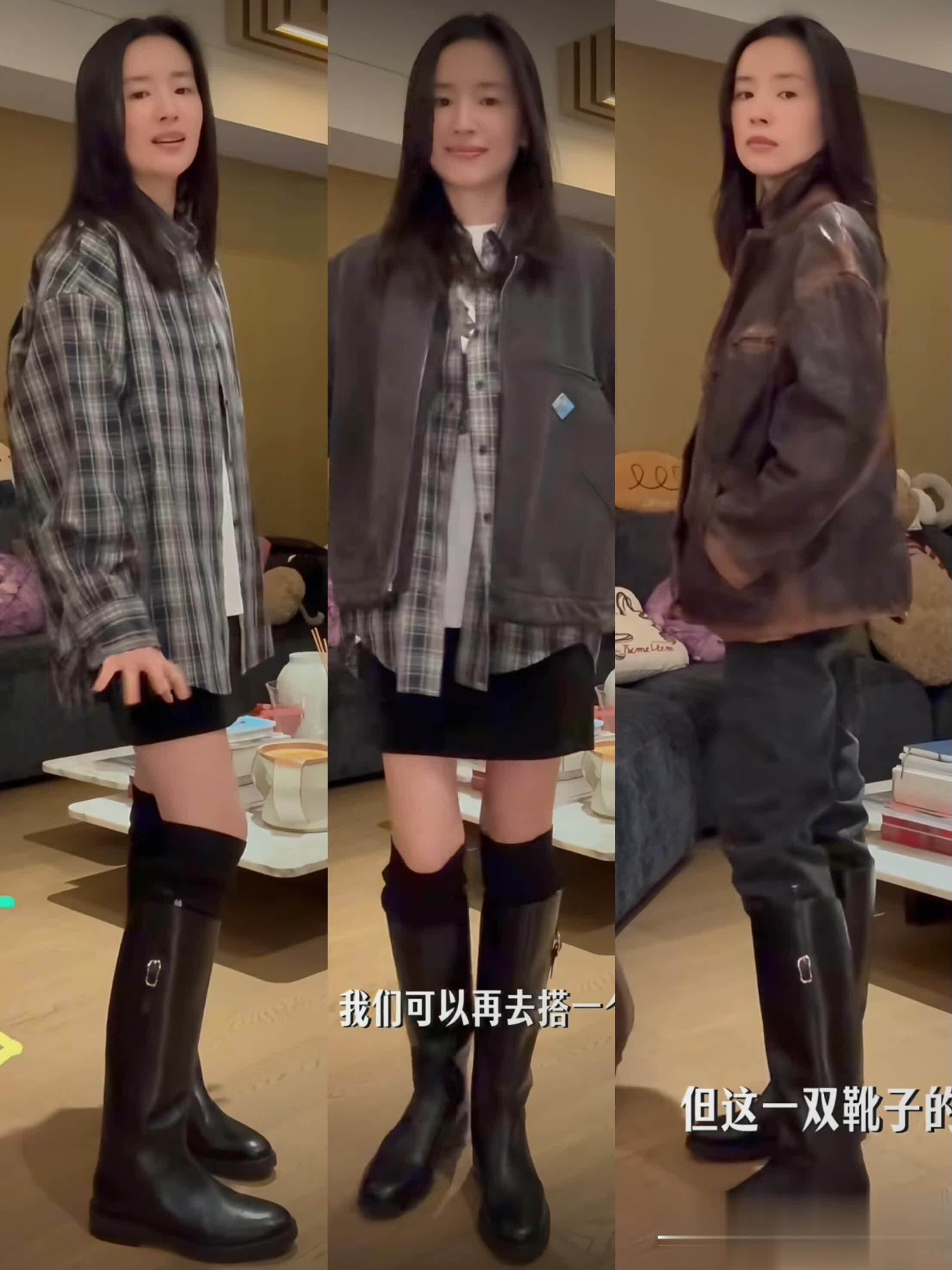 先看那套“灰色外套+格纹衬衫+黑长靴”,把“俏皮感”藏在细节里!灰色外套是那种软软的短款,版型不紧绷,搭在身上像裹了层暖乎乎的云朵,里面叠穿的格纹衬衫是红绿细格,领口和袖口悄悄露出来一点,瞬间打破灰色的沉闷,不会显得老气。下半身看不清具体穿了啥,但光看腿就知道是“小心机”——黑色长靴直接拉到膝盖下,靴筒紧紧裹着小腿,显得腿又细又直,裤脚大概是塞进靴子里了,利落得很。她把外套袖子挽了两圈,露出手腕上细细的手链,走起来带点晃悠的劲儿,像刚从街角咖啡馆出来的姐姐,去逛超市或者和朋友喝热饮穿,舒服又有精神,完全没有“明星摆拍”的紧绷感。